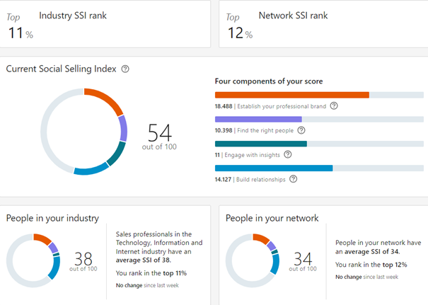 Social Selling Index to wskaźnik, który mierzy skuteczność działań użytkowników na platformie. Warto go regularnie sprawdzać, bo dzięki temu dowiadujemy się, czy nasze działania przynoszą oczekiwane efekty. Gdzie go znajdziesz? Pod tym linkiem, klikając „Get your score”. Wówczas otrzymasz zaprezentowane w ten sposób wyniki: